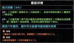 ④六件套效果,主要可以分为两点,第一点是火拳天降变成魔剑天降(但是不会触发连击效果)。第二点就是现版本为什么魔剑强的原因,不仅仅是因为魔剑的伤害增加了,而且连发的魔剑会锁敌,并且可以分裂锁敌,也就是说如果有三个敌人站在一起,那么三个敌人每个都能同时受到三个魔剑连发的伤害,同时也令以前魔剑原地连发的尴尬境地消失。