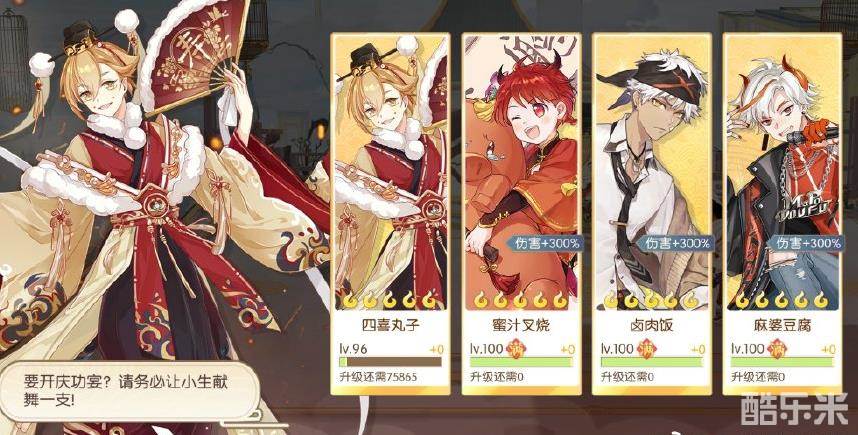如果没有蟠龙菜,则可以从驴打滚,飞龙,卤肉饭,叉烧,麻婆豆腐,桃花粥中挑选自己开花等级最高的3人配合四喜,四喜加攻击回合则用平a,其余回合使用技能保证打满5000伤害,输出亦可有30w左右,若自身四喜奶量不够则可以用吉利虾代替。