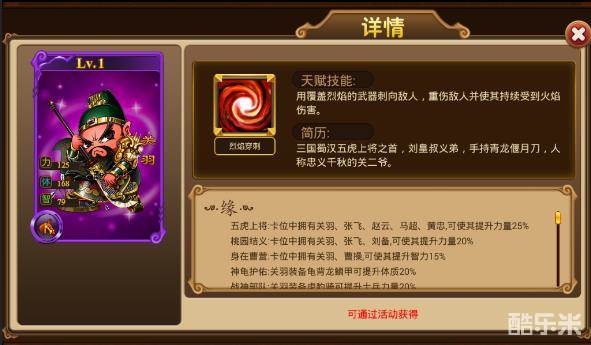 五虎上将:卡位中拥有关羽、张飞、赵云、马超、黄忠、可使其提升力量25%;