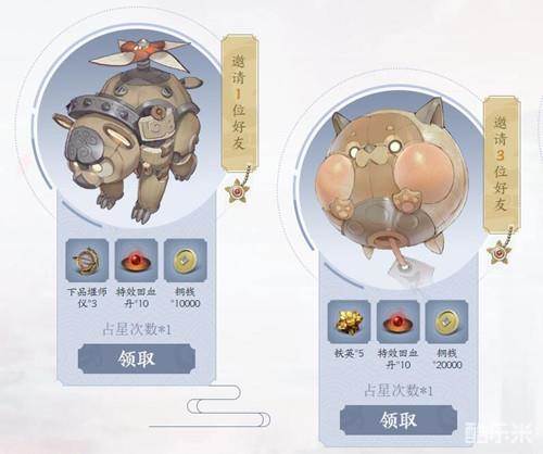 | 邀请1位好友 | 下品堰师仪*3+特效回血丹*10+铜钱*10000+占星次数*1 |