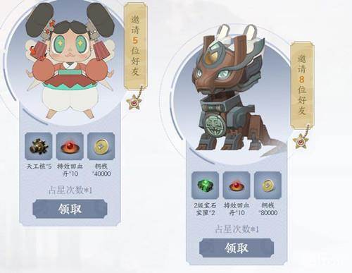 | 邀请5位好友 | 天工核*5+特效回血丹*10+铜钱*40000+占星次数*1 |