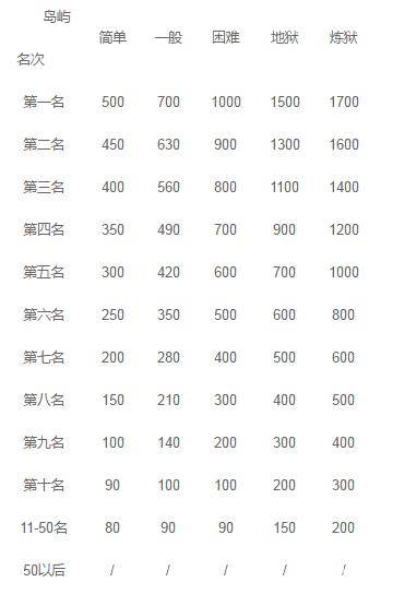 目前斩将分为5个岛屿:简单—一般—困难—地狱—炼狱。下面列一张表格来简述斩将的收入标准(如有纰漏,及时反馈);