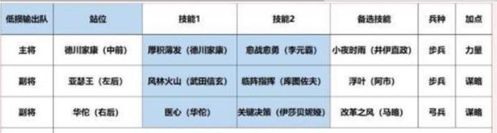 此阵容中的德川家康是主力输出将领,是队伍的主要输出来源;亚瑟王是副输出兼辅助,为队伍提供兵力恢复、驱散负面状态的效果,并提供一定的谋略输出;华佗为纯辅助,为队伍提供治疗效果,并依靠搭配的技能提升全员力量属性,从而提高德川家康物理输出能力和队伍的普攻伤害。