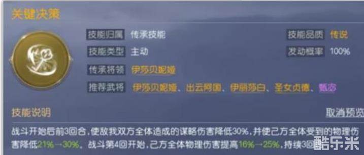 曹操的2技能则可以搭配技能【关键决策】,这是一个全面型的辅助技能。在战斗开始前3回合,降低敌我双方造成的谋略伤害并使我方全体受到的物理伤害降低。