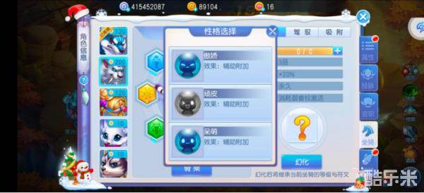 坐骑性格中有三种可以选择分别是骄傲,顽皮,以及呆萌。其中骄傲是伤害加成,顽皮是伤害与防御随机触发,呆萌就是纯防御。找好你需要的性格,宝宝将会更加完善。