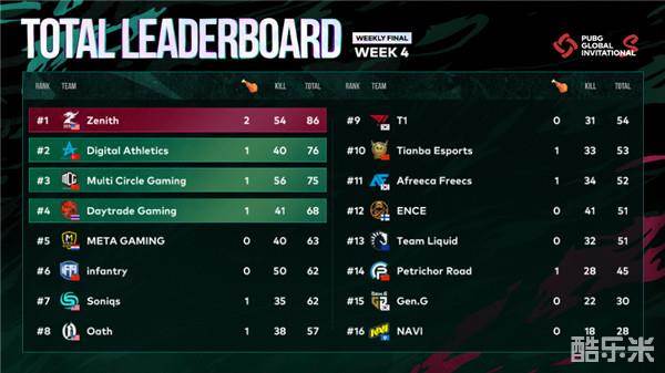 回看ZEN这四周以来的表现,他们在前三周发挥平稳,到了第四周突然爆发,两度吃鸡斩获周冠。由此看出在最后两周的冲刺阶段,对于没有拿过周冠的队伍也无需灰心,全力以赴依旧有可能一举夺得冠军,而对于曾经获得过丰厚的冠军奖金的队伍来说,稳中求进也是至关重要的,最后两周的大战势必更加火热,让我们拭目以待。