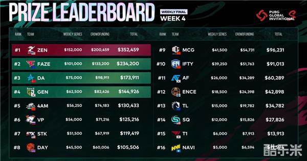 根据PGI.S的赛事规则,周决赛队伍除了在拿到赛事奖金池中的奖金份额外,还将按比例获得众筹奖金。本周ZEN战队在最终局稳住心态吃鸡获胜后拿到第四周周冠军,并获得奖金349822美金,一跃超过了原奖金榜第一名的FAZE,目前暂列榜首。