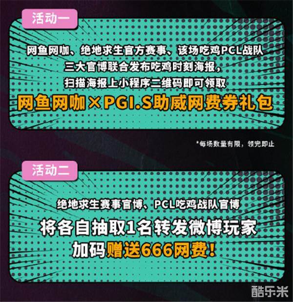 同时,比赛中凡是PCL战队吃鸡成功,赛事官方直播间、网鱼网咖官博共庆吃鸡时刻,扫码即可领取助威网费礼包。绝地求生官方赛事、战队官博也将转发加码抽送666元网费!