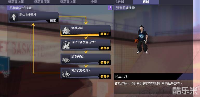 花式技能分为近投/近距离灌篮/近距离上篮/远距离灌篮/远距离上篮/中投/三分球/运球,
