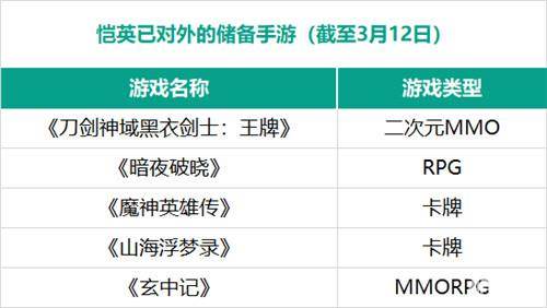 “研发、发行、投资+IP”的三核驱动,让恺英的产品储备在短时间内丰富了起来。据手游那点事统计,恺英的产品储备超过5款,涵盖了卡牌、MMORPG以及二次元这几个赛道。