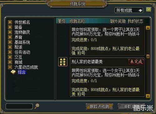 还有,就是只限女性玩家获取的“别人家老公最强”称谓,只有在游戏中忽悠一个男性道友,让其一天之内花掉500万元宝,并帮你赢得一场PK的胜利,就可以获得这个称谓啦!同样,男性角色也有一个“别人家的老婆最美”称谓可以获取,完成以上两个成就后,玩家还能获得800成就点奖励。