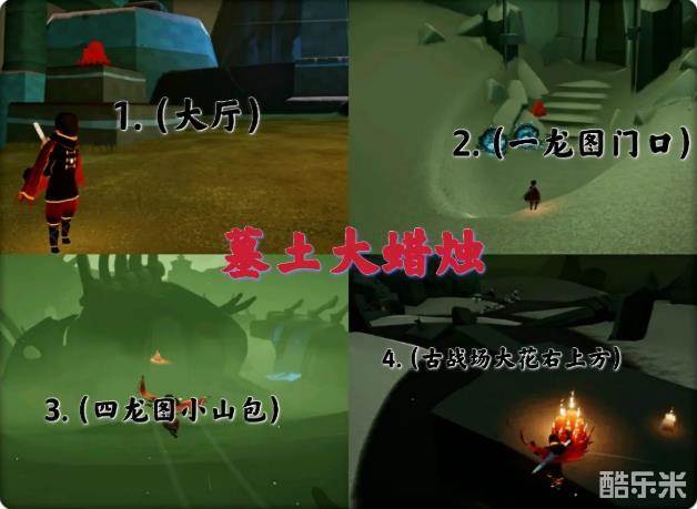 4、最后一个大蜡烛在墓土三龙图(远古战场)大花右前方的一个平台上。