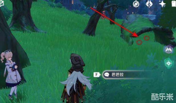 就在芭芭拉的后面的大树旁边,过去可以看到;