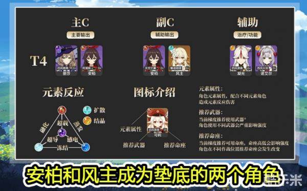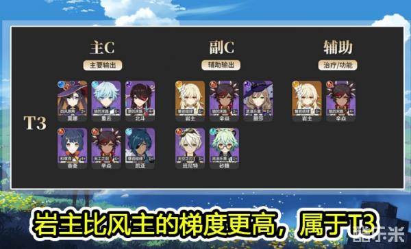 最后是T3和T4级角色,也就是当前版本强度比较差的角色,其实这两个梯队中的大部分角色都在之前的评级中出现过,比如莫娜是T1级副C和辅助,但是作为主C的话只能属于T3,北斗是T2级副C,但是作为主C也是T3。真正在T3级中出现的角色只有两个,岩主和丽莎,T4中的角色只有风主和安柏,纵观各路排行榜,安柏几乎万年垫底。