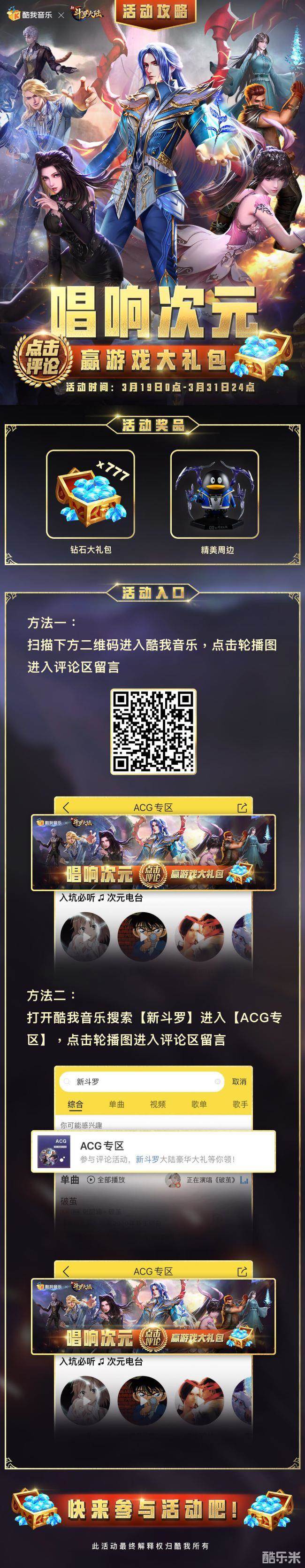 由酷我音乐和新斗罗大陆手游共同打造的“唱响次元”活动火爆开启!777钻石大礼包和精美周边礼品等你来领!(点击更新游戏)