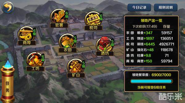 领地的任务系统会产出其他成长系统需要的资源,如武将进阶材料、装备进阶材料、坐骑碎片、兵法碎片、点将符、元宝等。