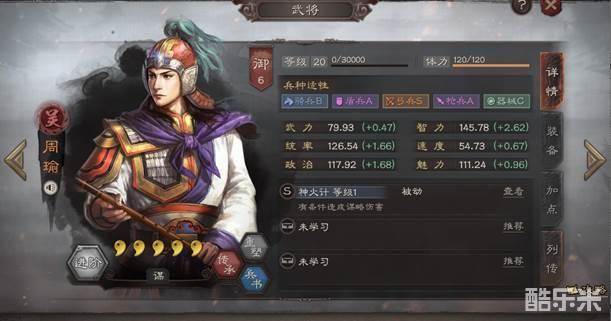 首先看周瑜的面板,兵种适性S弓,超高智力成长,统帅在谋略型武将中也算比较高的,面板相当不错。