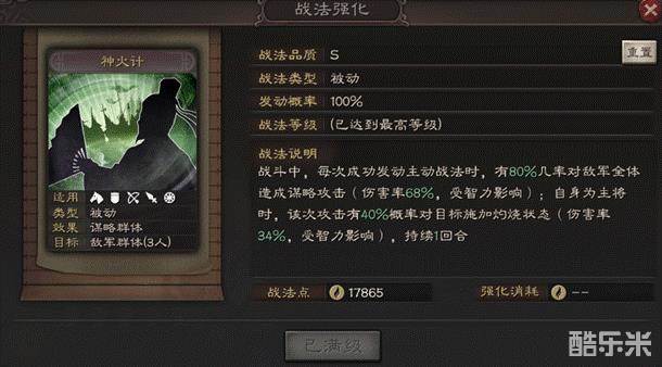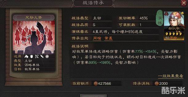 传承战法【风助火势】,单体谋略伤害,发动几率较高,配合灼烧状态可打出巨额伤害。