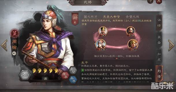 第二,是东吴大都督,周瑜和鲁肃、吕蒙、陆逊可以激活,这四人分别在不同的时期就任吴国的大都督,激活这一缘分可以说是实至名归,这一缘分能够提高全军速度属性和主动战法的伤害。