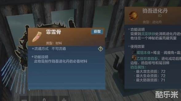 霏雪骨是用于制作驺吾进化丹的材料之一,而驺吾进化丹可以将制定的合成异兽进化为神兽驺吾,拥有更加帅气的外形和更加强大的作战能力。