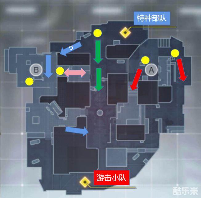 进攻方进攻B点:可以采取点2人,中路2人,出生点末端的人员分配(蓝色圆圈)。