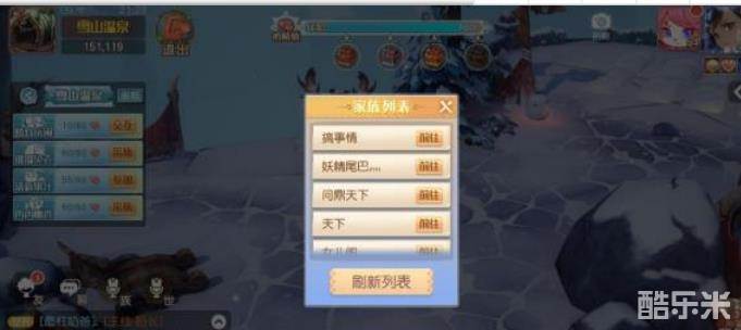 如果吧友所处家族没有成员参加雪山温泉,那么也可以前往其它家族串门,方法是:点击左上角的“串帮”按钮,再选择任意家族即可。吧友就能与其它家族成员互动,该方法也能够增加心情值,但不会超过200点上限哦。