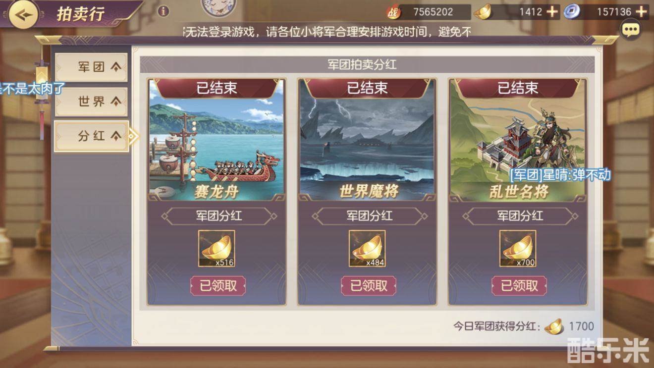 3、选择好你想要玩的区,开区时间一到立刻进区。进区后什么剧情,一律跳过,抓紧时间消耗体力,提升战力,推主线剧情和黄天关卡。前期获得的元宝,每日体力买满。其余全部抽卡。多余的时间不要浪费,以最快的速度消耗完体力后,加上抽卡,这时候你的战力应该在10-15万之间不等。马上打开竞技场,开始冲击排名,次数用光就买,实在打不过就换一批。我开区这样冲到了第4名,虽然马上就被顶下去了,但是却收获比别人多了几千元宝。4,日常活动,一定要参加。一次活动军团分红就是几百元宝,少做几次就损失一个十连,尤其是周六日,一定不能错过。有分红加成。不说废话上区第一军团分红图: