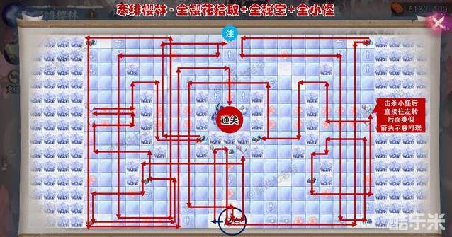 以上就是阴阳师寒绯樱林的通关路线图,按照以上路线图走即可拿到全部的樱花跟宝箱了哦。