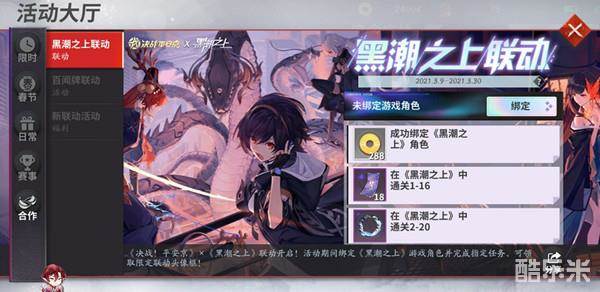 近期,黑潮之上开启了和决战平安京的联动活动,两个手游的玩家互相交换绑定联动码并完成相应的任务即可赢取丰富的奖励。