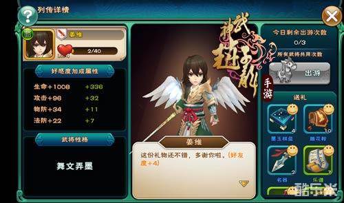 每天可以邀请武将出游3次,所有武将共享次数。出游中会随机发生一种事件,不同的事件会有不同的奖励。送礼可以快速提升武将好感度,没有礼物可以前往礼物商店购买。而且每个武将的喜好不同需要投其所好送出礼物,每个武将性格会影响其对某类礼物的喜好,收到喜欢的礼物可获得最大好感度,收到不喜欢的礼物,只能获得少量好感度。