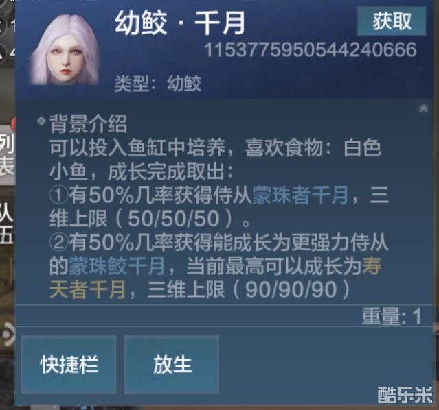 2、有50%几率获得能成长为更强力侍从的蒙珠鲛千月,当前最高可以成长为寿天者千月,三维上限( 90/90/90 )