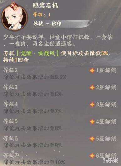 | 等级1 | 苏轼【觉醒·快哉风】降低目标攻击5%,持续1回合。 | / | |