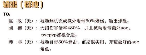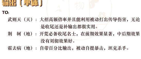 如果需要群体输出,那么嬴政,刘彻以及韩非都很强,韩非初期自带了30暴击,在新手开荒期则是最为强大的aoe角色,所以小编在这里推荐,单体选择武则天,aoe选择韩非。