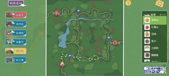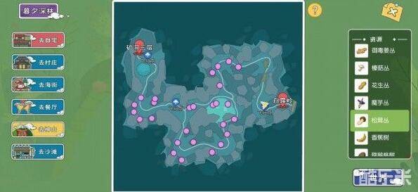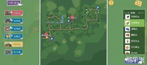柠檬、柿子、蓝莓、蘑菇(晚上可以看到)、灯闪果(果丛附近的位置)、和雨籽、忍冬花(果丛附近的位置)、万顷笋。
