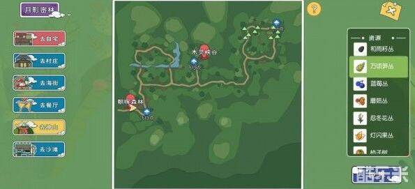 2、月影密林:柠檬、柿子、蓝莓、蘑菇(夜晚刷新)、灯闪果(果丛附近随机刷新)、和雨籽、忍冬花(果丛附近随机刷新)、万顷笋。