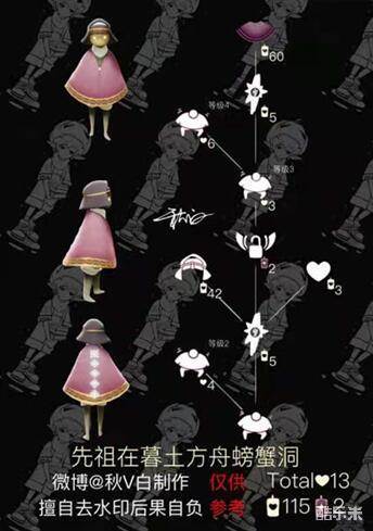 全部兑换完的话需要115白蜡烛,2红蜡烛,13颗爱心,先祖的位置就在墓土方舟的螃蟹洞里。