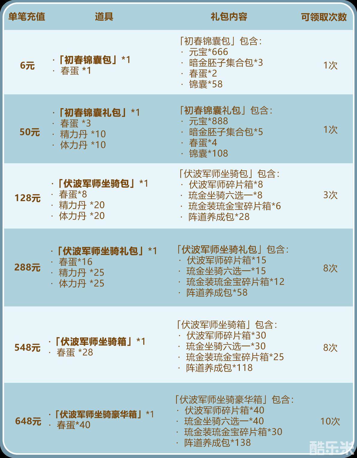 3.「初春礼盒」可开出:初春随机字卡包*111、玄阵养成包*50、觉醒丹*888、天命石*888、极品精炼石*888、安魂石*666、军师列阵包*40、名将图鉴包*40、宝物精炼石*888、初春随机字卡包*6、玄阵养成包*5、觉醒丹*100、天命石*100、极品精炼石*22、安魂石*11、军师列阵包*1、名将图鉴包*1、宝物精炼石*60中的随机1种。