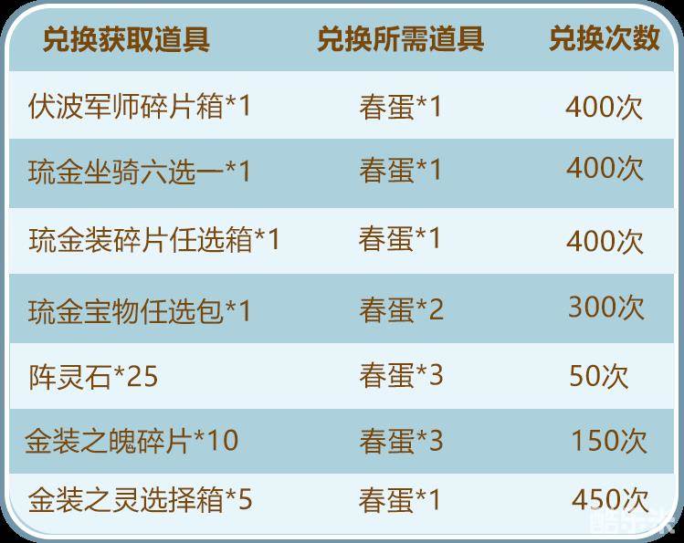 「春蛋」可用来兑换伏波军师碎片箱、琉金坐骑六选一、琉金装碎片任选箱、琉金宝物任选包等稀有资源: