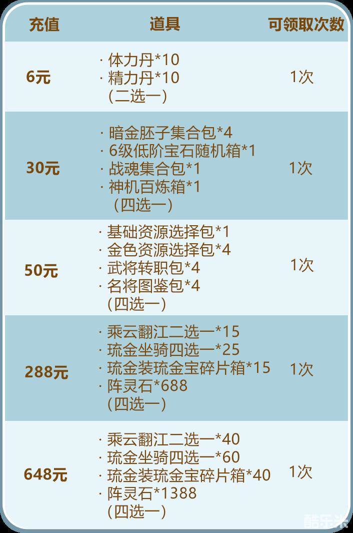 在活动期间少年们单笔充值至指定金额,即可获得伏波军师碎片箱、琉金坐骑六选一、琉金装琉金宝碎片箱、阵道养成包、春蛋等资源: