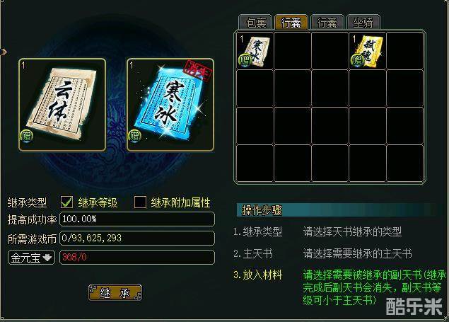 另外,若玩家对蓝、金品质天书的基础属性不满意,也可以通过天书转属功能将不满意的属性替换,操作方式与天书强化一致。如果转属成功,则系统将重新生成一条基础属性用来替换玩家指定的基础属性,该基础属性的数值也会重新生成。不仅如此,玩家也可以使用天书继承功能,将主、副天书的的等级互换,帮助玩家快速完成天书升级。
