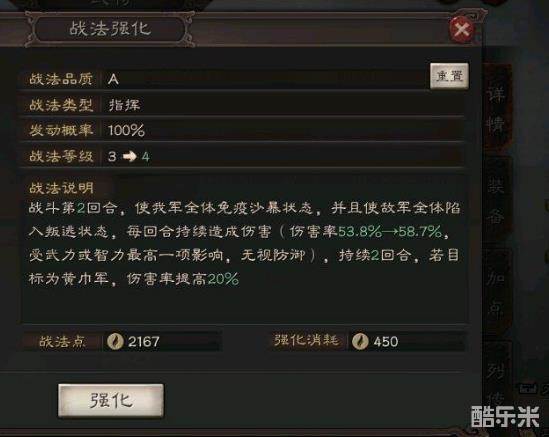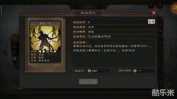 图上是颜良的勇冠三军,伤害率如果普攻8回合会达到30%*8*180=432%. 伤害不算高不过附带了震慑效果。配合了连击之后造成的伤害期望变为30%*8*180*1.45=626.4%