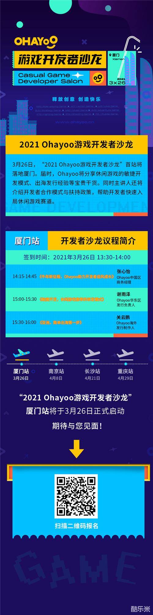 除了以上内容,3月26日的Ohayoo休闲游戏开发者沙龙厦门站现场还有更多行业干货等着你!携手Ohayoo打造下一个爆款的机会就在眼前,开发者们赶紧抓紧机会,扫描下方二维码或者点击阅读原文报名参与吧!