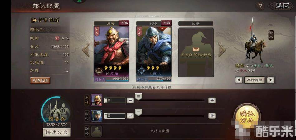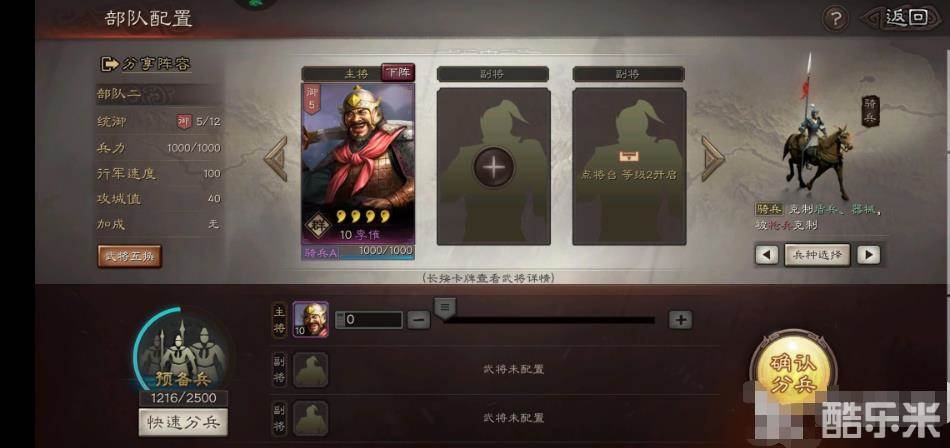 我们可以在左下角看到预备兵的数量,提升兵力主要就在此处,玩家可以给主将和副将手动配置士兵数量,也可以选择更方便的方式,也就是直接点击快速分兵,在预备兵充裕的时候,小编建议大家把兵都补齐,这样才能达到兵力的最大。