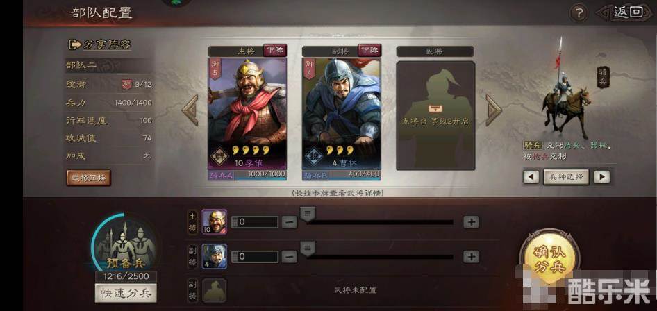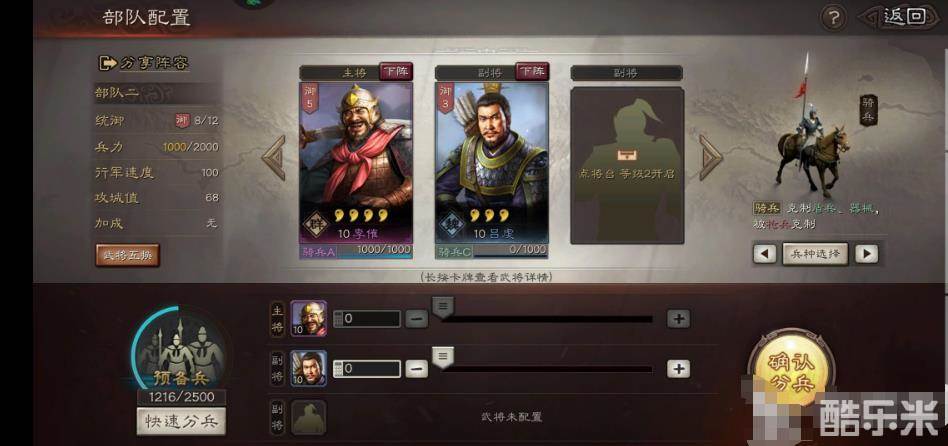 我们把副将换为吕虔,可以看到兵力上限就由之前的1400变成了2000,这时只需要拥有充足的预备兵,就能把兵力提高到两千了。