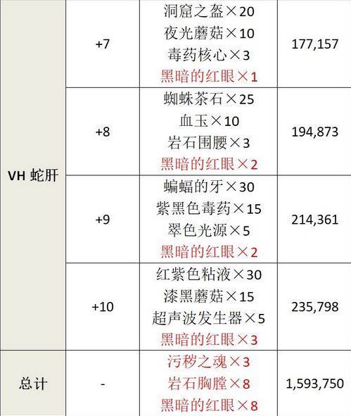 这图是强化一把降魔装备到+10所需的素材数量以及金币,其中标红的是精英怪的素材,可以看到强化满一把+10需要1,593,750金币,自己金币不是很多的,掂量好应该强化哪件装备。