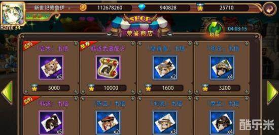 荣誉商店:主公可通过竞技场来赚取荣誉,然后在荣誉商店中够买武将装备配方以及武将书信。