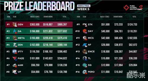 PGI.S第五周的赛事已经全部结束,在截止目前为止的奖金榜中,我们可以看到目前GEN一骑绝尘,以880397美金的总奖金额领跑奖金榜,远远拉开了与其余战队的差距。而第二名到第四名这三支队伍之间的差距并不算大。