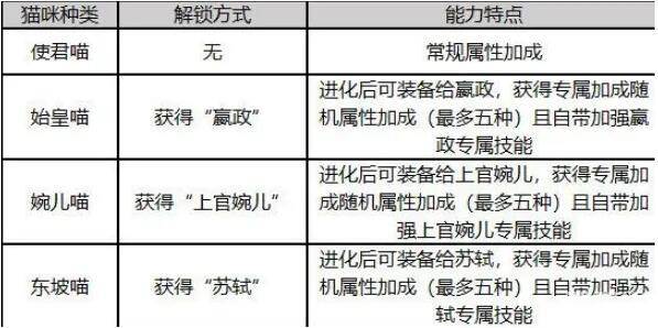 成长值达到900点之后就可以进化为风华喵,游戏中每一位名士都能装备与自己相对应的名士猫,名士猫能够带来不错的属性及技能效果的加成。