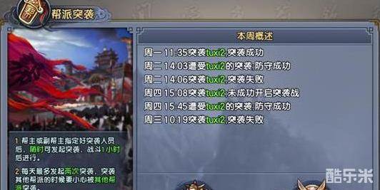 所有的帮主或副帮主在每周周一至周日的12点间皆可开启突袭战,需要的只是一个敌对帮派目标。突袭战分攻守双方,开启后,双方可入场,1分钟准备时间后,开始战斗,攻方最多进20人,守方最多进30人,攻守双方都有复活次数的限制,超过次数后,再次复活就出场,攻方出场后无法在补充人员,守方出场后可以补充人员。