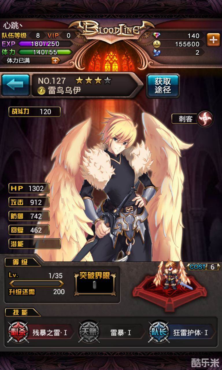 初始属性:战斗力 120. HP 1302. 攻击 912. 防御 742. 回复 462.
